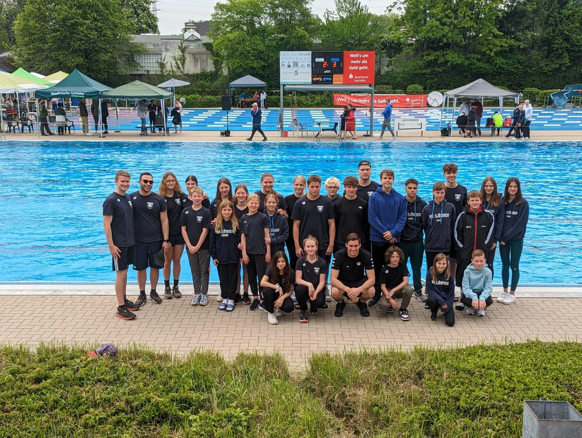 Am vergangenen Wochenende stand für die SG Lünen die erste Meisterschaft auf dem Wettkampfplan: die Südwestfälischen Meisterschaften in Iserlohn. Dafür hatten sich 38 Schwimmerinnen und Schwimmer von der SG Lünen qualifiziert.Für alle waren es allerdings schwierige Umstände: Denn die Südwestfälischen Meisterschaften in Iserlohn fanden im Freibad statt. Damit war es der erste Freibadwettkampf überhaupt - und besonders den Rückenschwimmerinnen und -schwimmern macht das Probleme: Denn sie konnten sich nicht an einer Hallendecke orientieren.