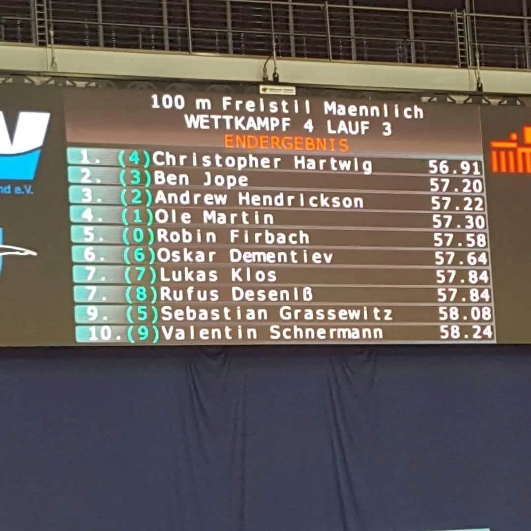 Denn am Donnerstag zeigten die Böckmann-Zwillinge ihr Können über die kurze Bruststrecke. 50 Meter galt es zu schwimmen, für Tim Böckmann eine Premiere. Zunächst ging jedoch sein Bruder Jan im ersten Lauf an den Start und schwamm die Strecke in 00:32,68. Eine neue persönliche Bestzeit und zudem auch noch zum ersten Mal unter 33 Sekunden. Eine Sensation. Doch wenig später machte es Tim nicht anders. Er schlug in 00:32,98 Sekunden an – ebenfalls eine Bestzeit, trotz eines nicht ganz so guten Anschlags. „Nervös war ich nicht wirklich, ich habe vor dem Start irgendwie einfach alles ausgeblendet“, erzählt Tim von seinem Start. Das hat bei ihm, wie auch bei Jan gut funktioniert: Beide haben wirklich starke Leistung in ihrer Paradedisziplin abgerufen und super Platzierungen im Mittelfeld erreicht.