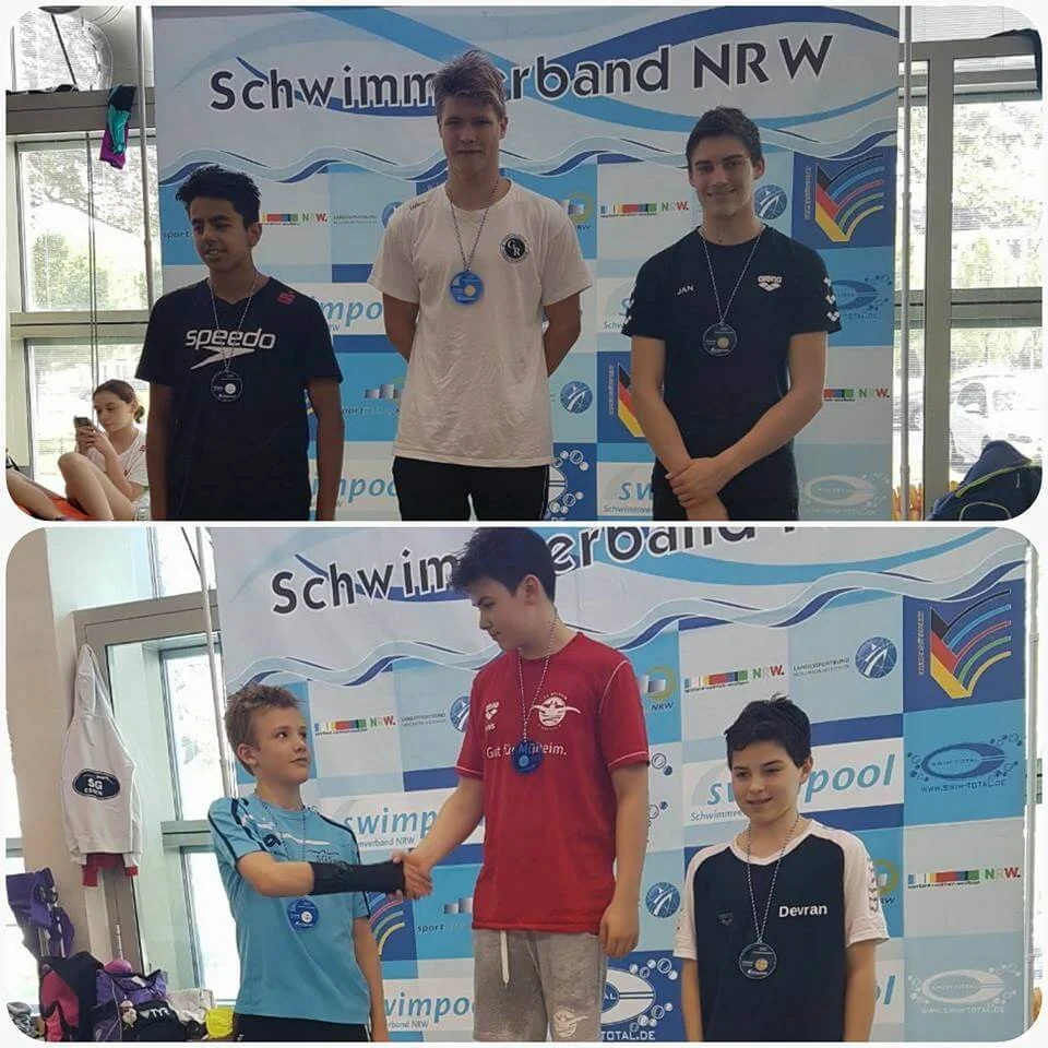 Nachdem Ende April der Schwimmverband Nordrhein-Westfalen seine Meister in der offenen Klasse und den älteren Jahrgängen suchte, traten am vergangenen Wochenende im Dortmunder Südbad die Besten aus NRW in den jüngeren Altersklassen an. Die SG Lünen war gleich mit neun Aktiven vertreten: Jan und Tim Böckmann (beide Jg. 03), Jonathan Gröne, Jan-Philipp Kortmann, Felix Reichmann (alle Jg. 02), Tom Ribbing, Doreen Schulz (beide Jg. 03), Devran Sensoy (Jg. 04) und Jannis von Hof (Jg. 03) konnten sich im Vorfeld für die Meisterschaften qualifizieren und gingen insgesamt 22 Mal ins Wasser.