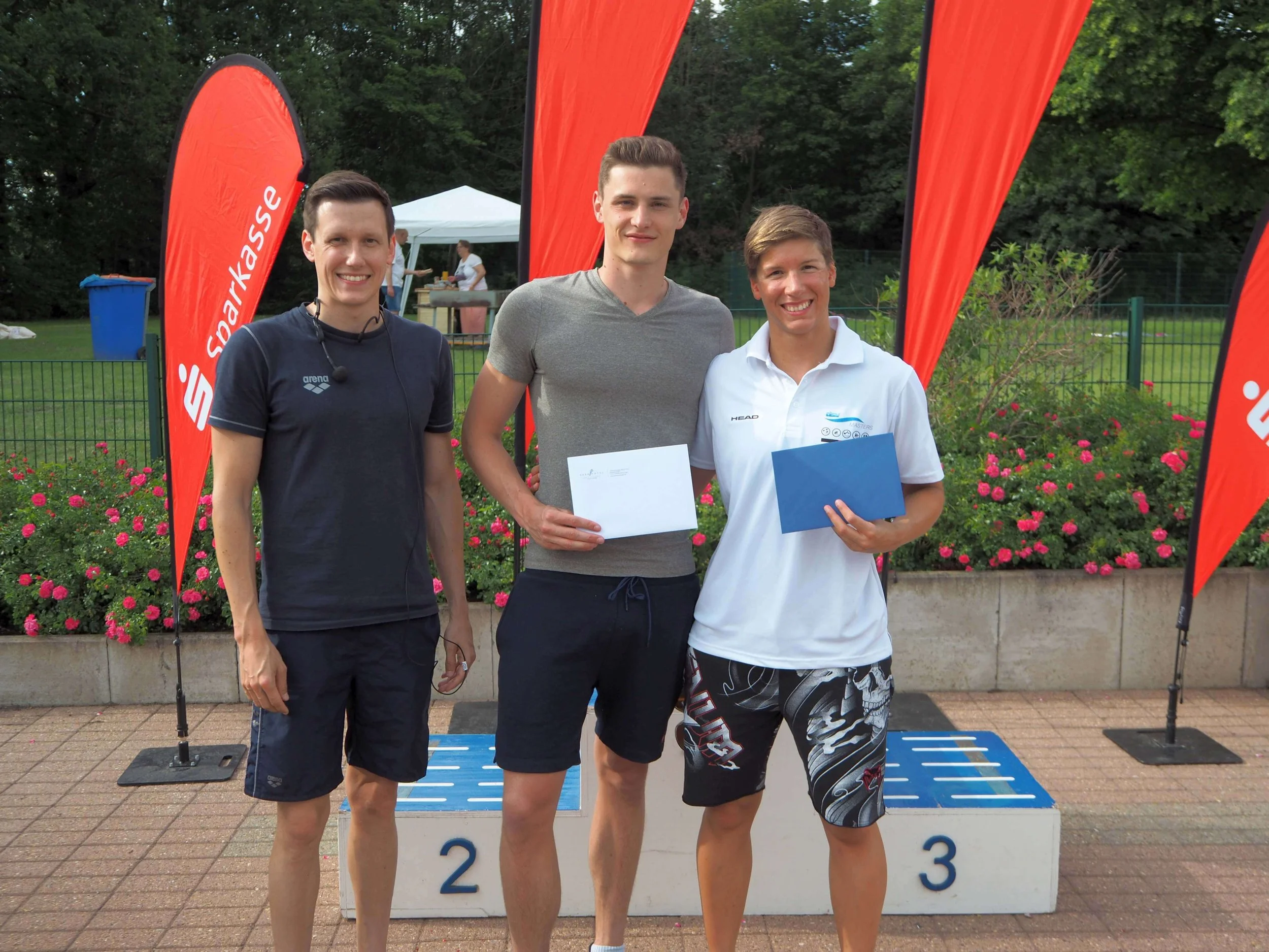Doch vor allem die Männer der SG Lünen schafften es immer wieder ins Finale und überzeugten da gegen die Konkurrenz: Gerrit Gutscherra (1995) sicherte sich in seinem 100 Meter Schmetterlingfinale den Sieg, Christian Fahrenholz (1992) ließ über die 100 Meter Brust im Finale alle hinter sich. Spannend wurde es vor allem aber im 100 Meter Rückenfinale: Dort schwammen gleich drei Lüner: Jan-Philipp Kortmann (2000), Jonathan Gröne (2002) und SG1-Trainer Dominik Patzelt (1995). Nach einem spannenden Rennen konnte Jonathan Gröne seinen Trainer Dominik Patzelt auf der letzten Bahn überholen und sicherte sich damit hinter Rouven Nagel von der SG Dortmund den zweiten Platz. Dominik Patzelt wurde dritter, Jan-Philipp Kortmann vierter.Trotzdem Jan-Philipp über die 100 Meter Rücken nur mit der Holzmedaille nach Hause gehen musste, konnte er im Finale über die 100 Meter Freistil den dritten Platz belegen. Vor ihm stand Rufuß Deseniß (2004) auf Platz zwei. Ebenfalls für Finals qualifiziert hatten sich Felix Aubke (2000, 100 Meter Schmetterling), Jan Böckmann (2003, 100 Meter Freistil) und Marie Bloehs (2001, 100 Meter Rücken).